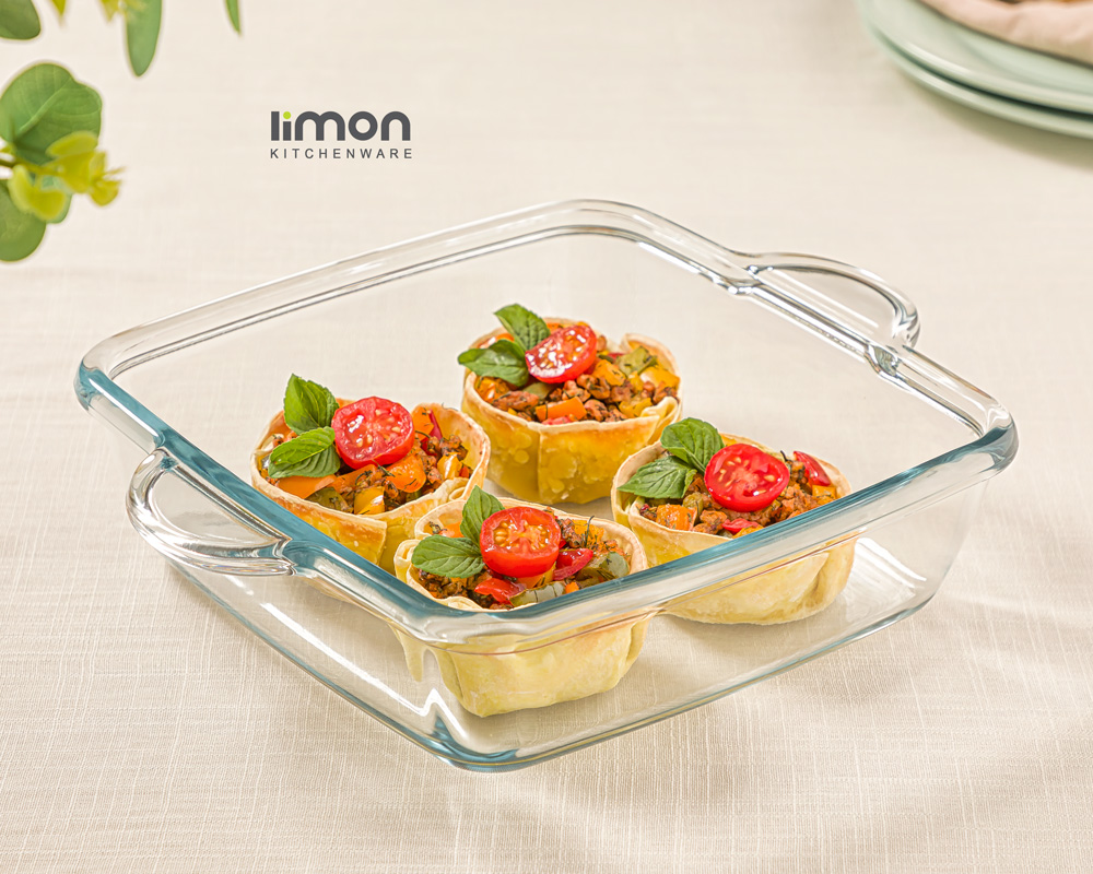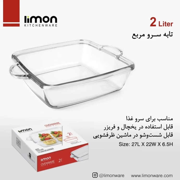 تابه سرو شیشه ای مربع 2 لیتر ابعاد: طول (با دسته) 27 عرض 22 ارتفاع 6.5 سانتیمتر . مناسب برای سرو غذا قابل استفاده در یخچال و فریزر قابل شستشو در ماشین ظرفشویی .