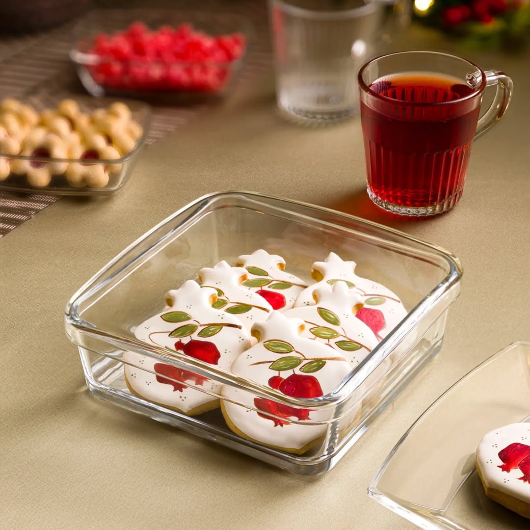 بیسکویت خوری شیشه ای مربع . دارای جعبه کادویی جنس در ب و بدنه هردو شیشه ای میباشد .