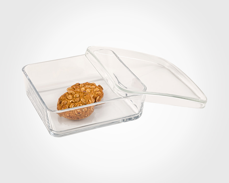 بیسکویت خوری شیشه ای مربع . دارای جعبه کادویی جنس در ب و بدنه هردو شیشه ای میباشد .