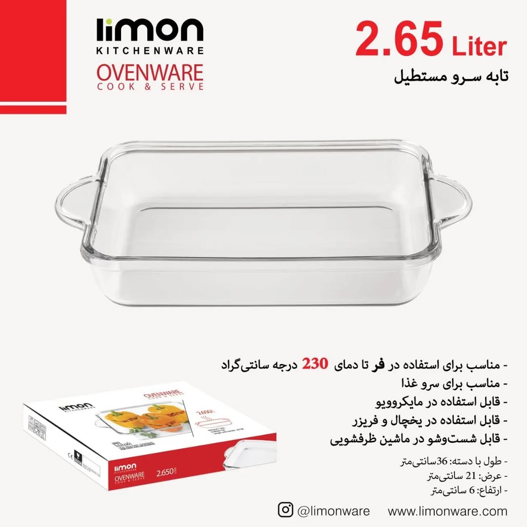 تابه شیشه ای مستطیل 2.65 لیتر . . ابعاد: طول 36 عرض 21 ارتفاع 6 سانتیمتر . حجم: 2.65 لیتر . . مناسب برای استفاده در فر تا دمای 230 درجه سانتیگراد مناسب برای سرو غذا قابل استفاده در ماکروویو قابل استفاده در یخچال و فریزر قابل شستشو در ماشین ظرفشویی